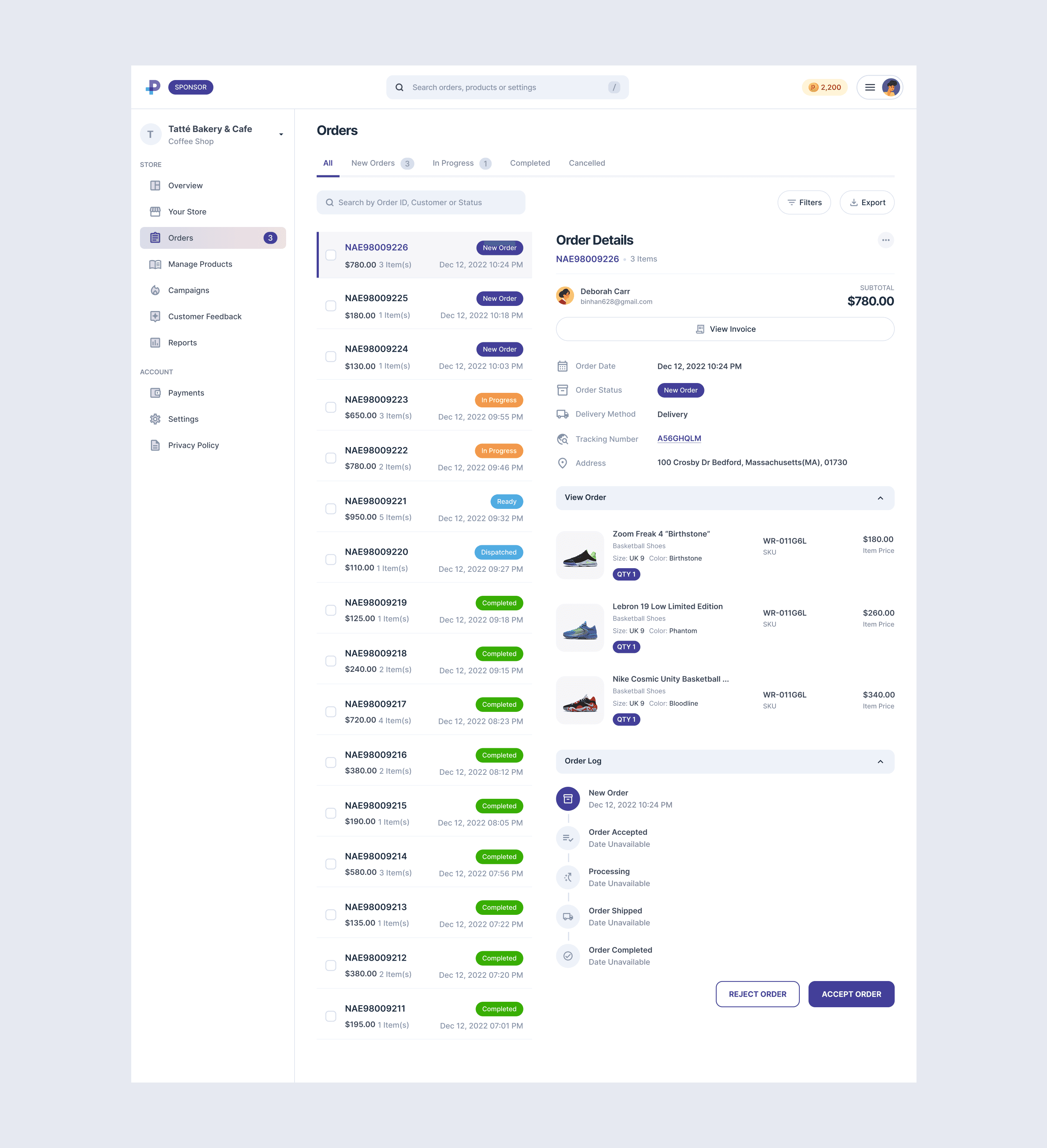 Order management is one of the most critical aspects of the sponsor experience. During busy periods, businesses need to quickly review incoming orders and update their status without navigating multiple screens. To support this workflow, the orders interface was designed using a split-view layout.